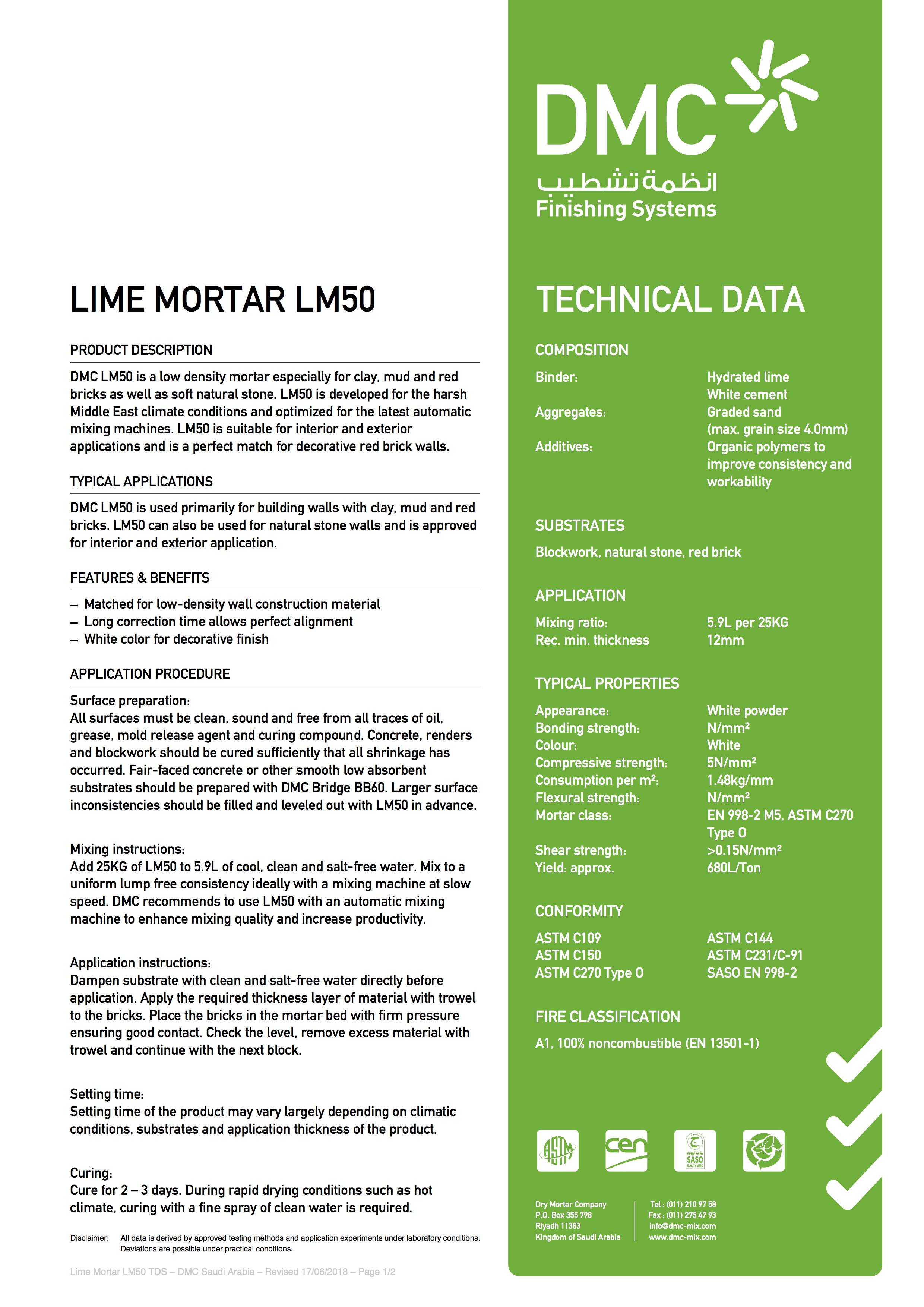 DMC Lime Mortar LM50 is a low density mortar especially for clay, mud and red bricks as well as soft natural stone