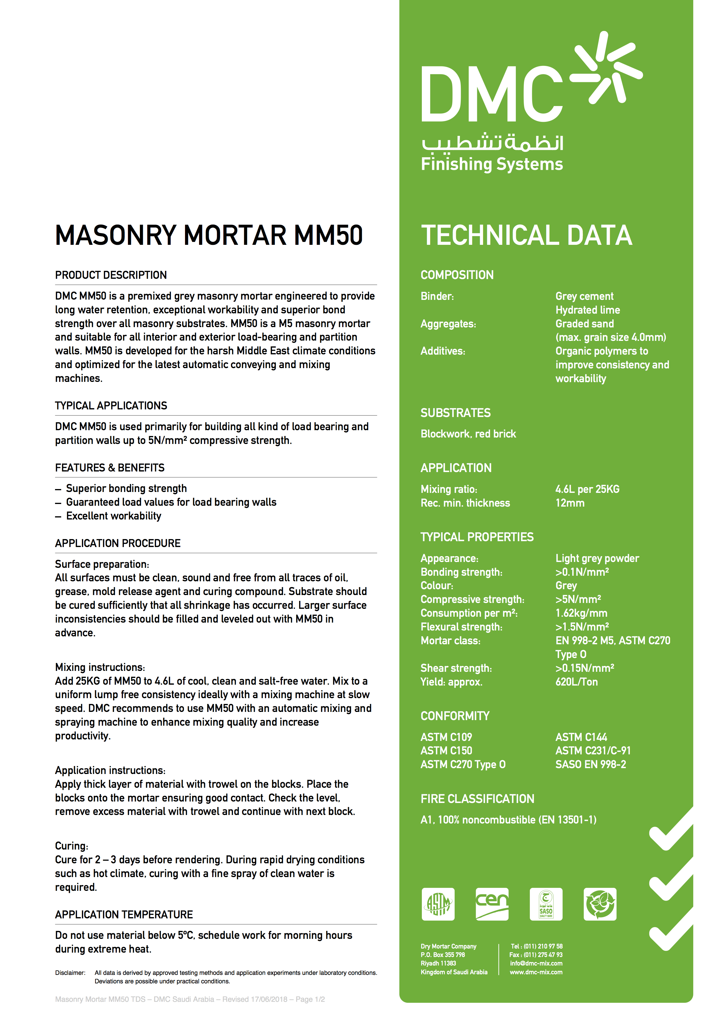 DMC Masonry Mortar MM50 is a premixed grey masonry mortar engineered to provide long water retention, exceptional workability and superior bond strength over all masonry substrates