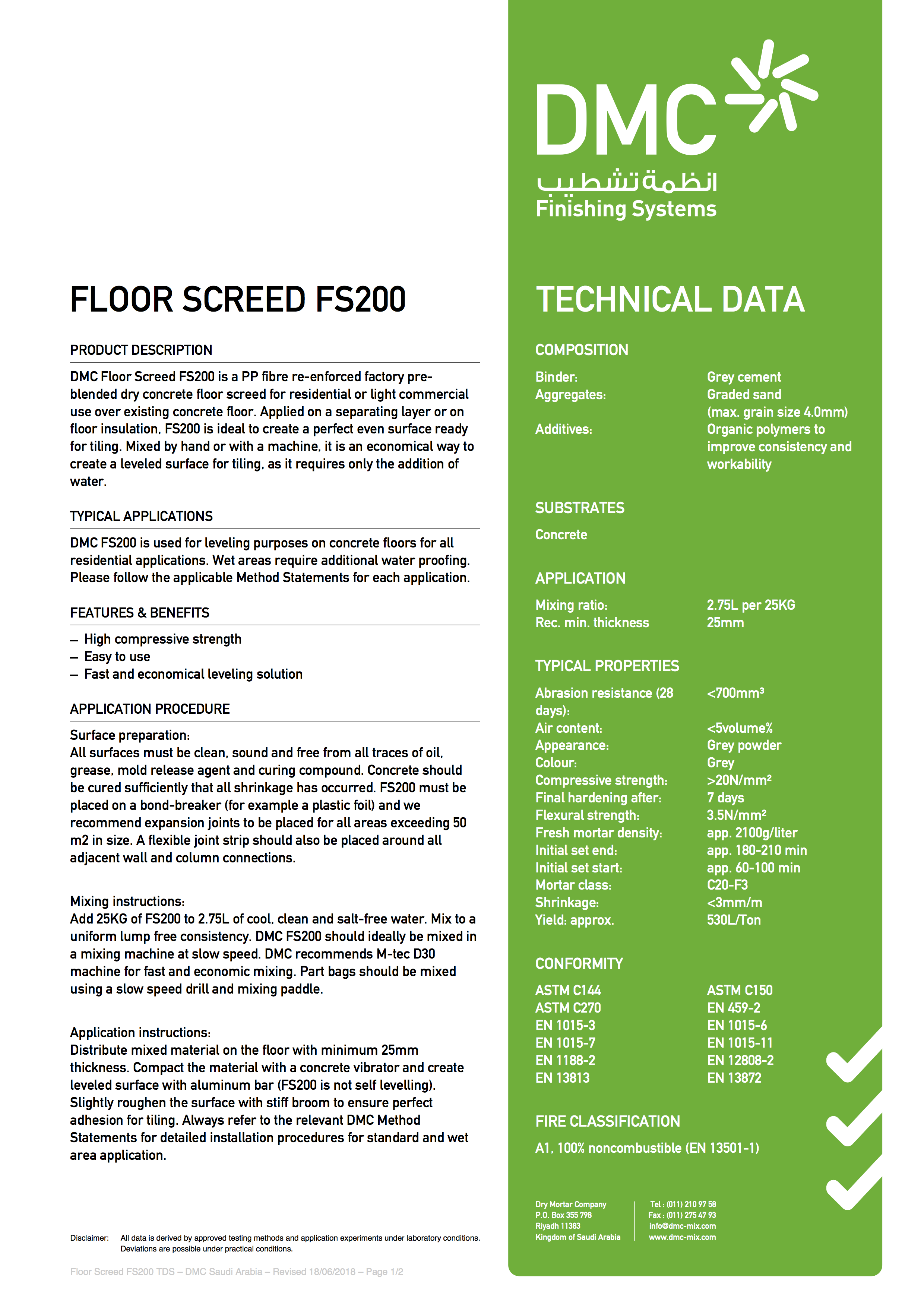 DMC Floor Screed FS200 is a PP fibre re-enforced factory pre- blended dry concrete floor screed for residential use over existing concrete floor.