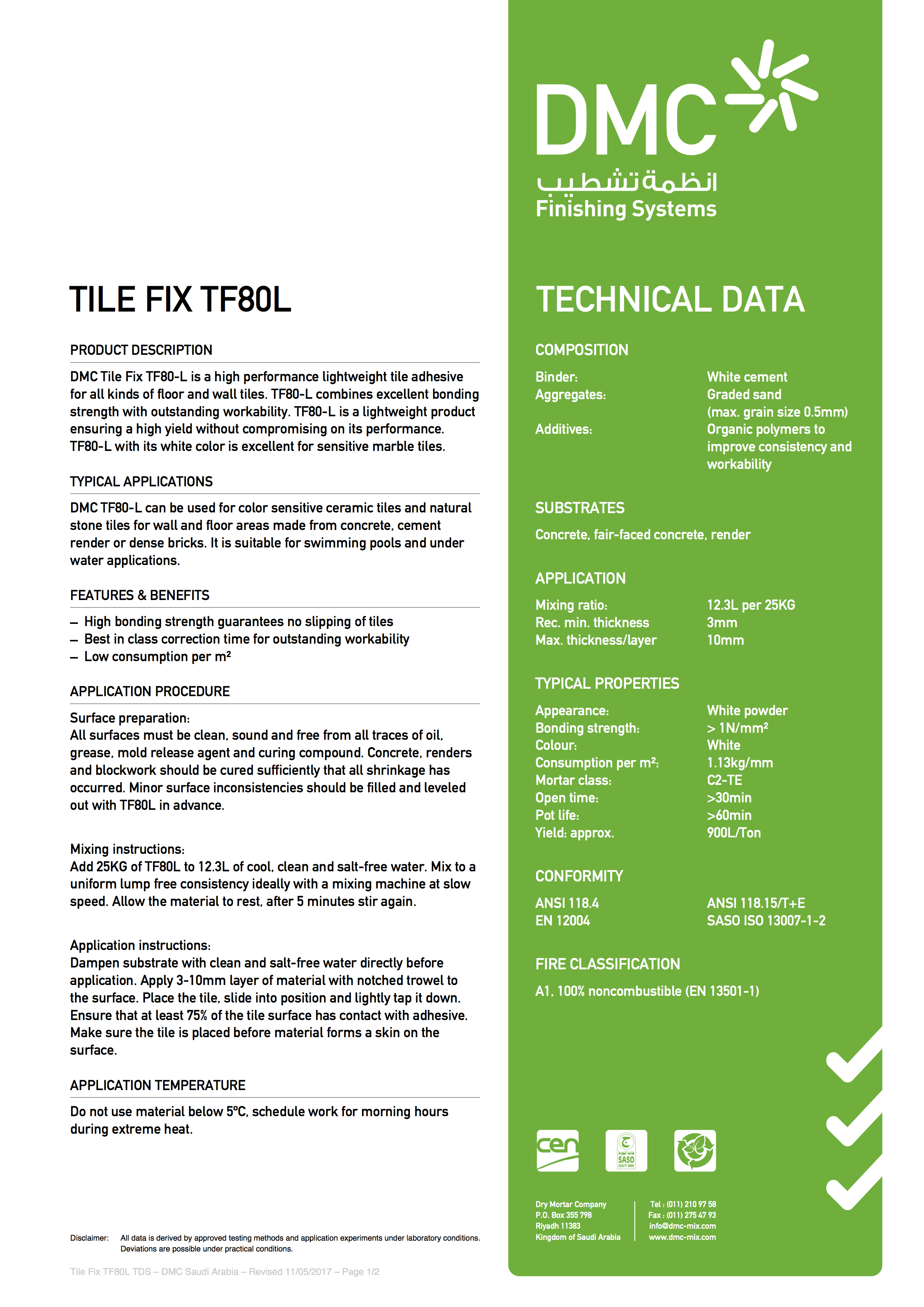 DMC Tile Fix TF80-L is a high performance lightweight tile adhesive for all kinds of floor and wall tiles. TF80-L combines excellent bonding strength with outstanding workability