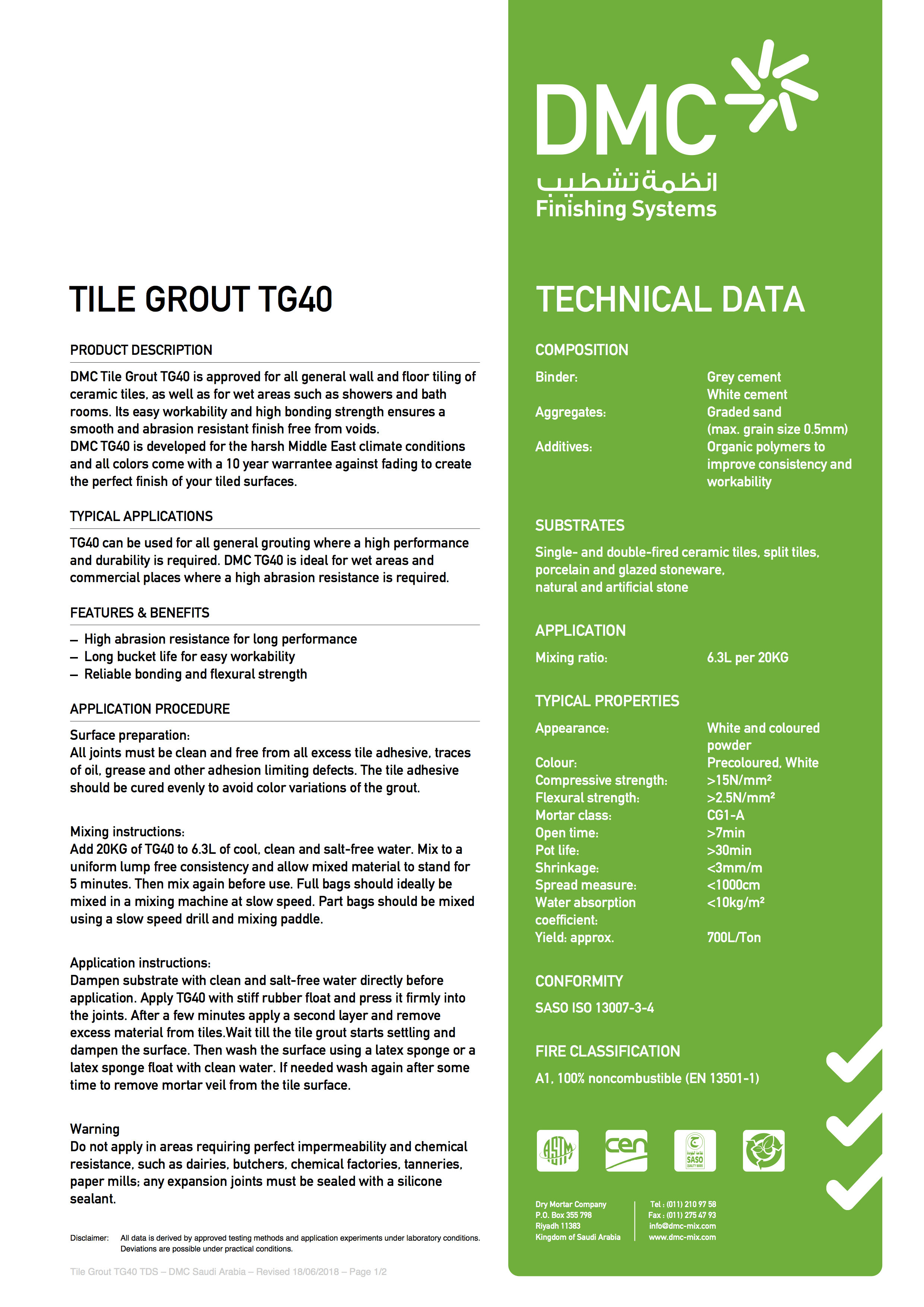 DMC Tile Grout TG40 is approved for all general wall and floor tiling of ceramic tiles, as well as for wet areas such as showers and bath rooms