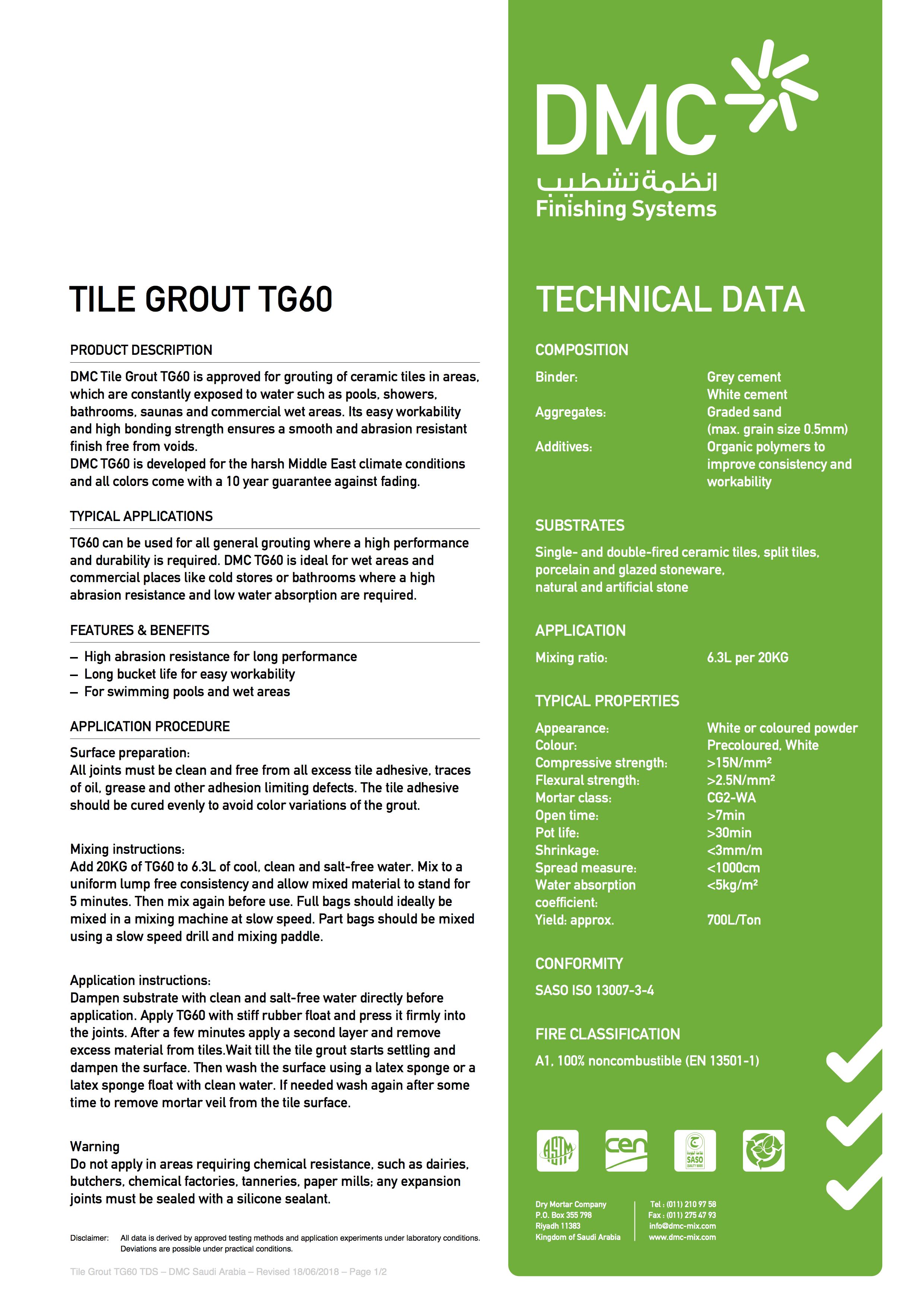 DMC Tile Grout TG60 is approved for grouting of ceramic tiles in areas which are constantly exposed to water such as pools, showers, bathrooms, saunas and commercial wet areas