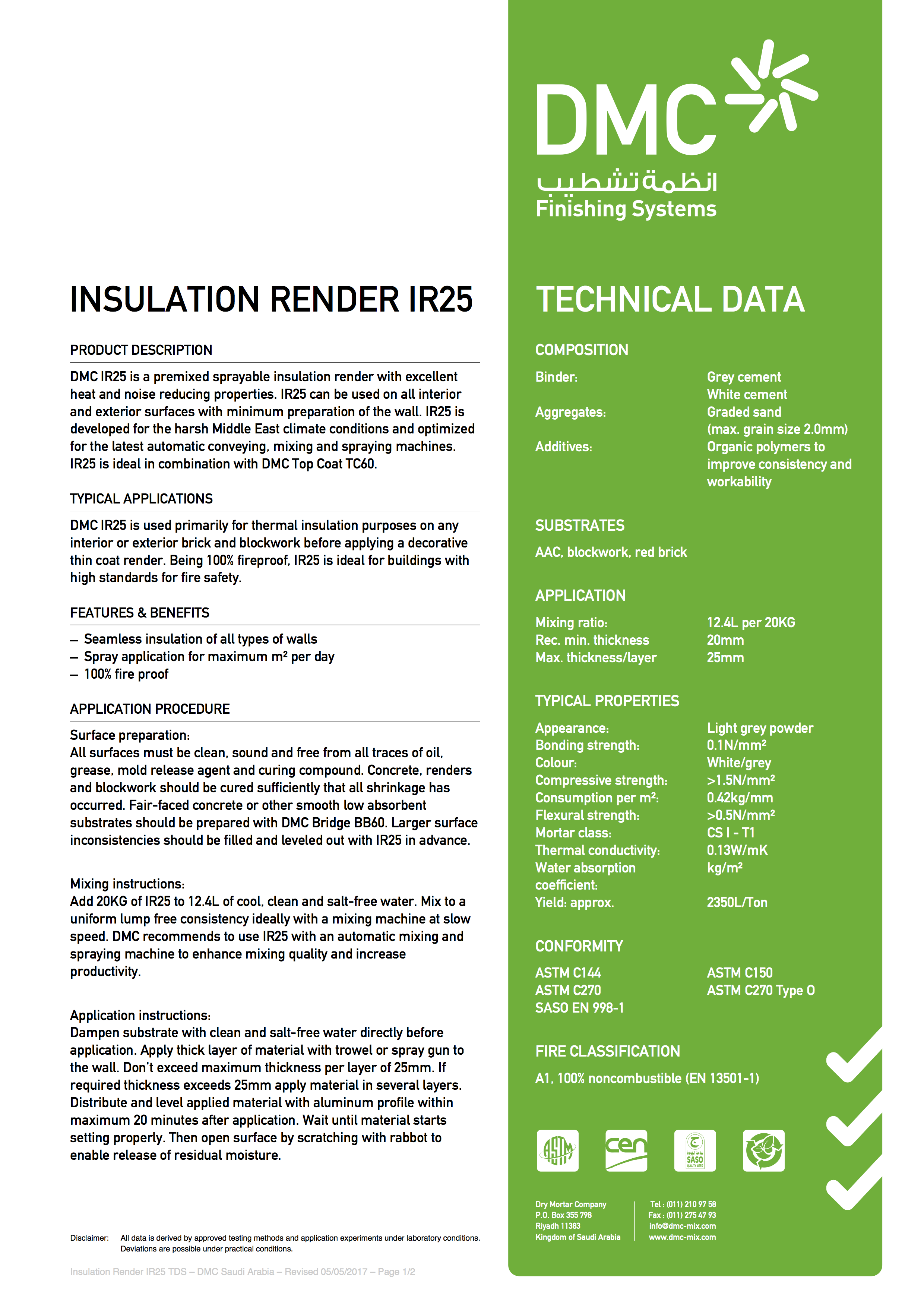 DMC Insulation Render IR25 is a premixed sprayable insulation render with excellent heat and noise reducing properties. IR25 can be used on all interior and exterior surfaces with minimum preparation of the wall