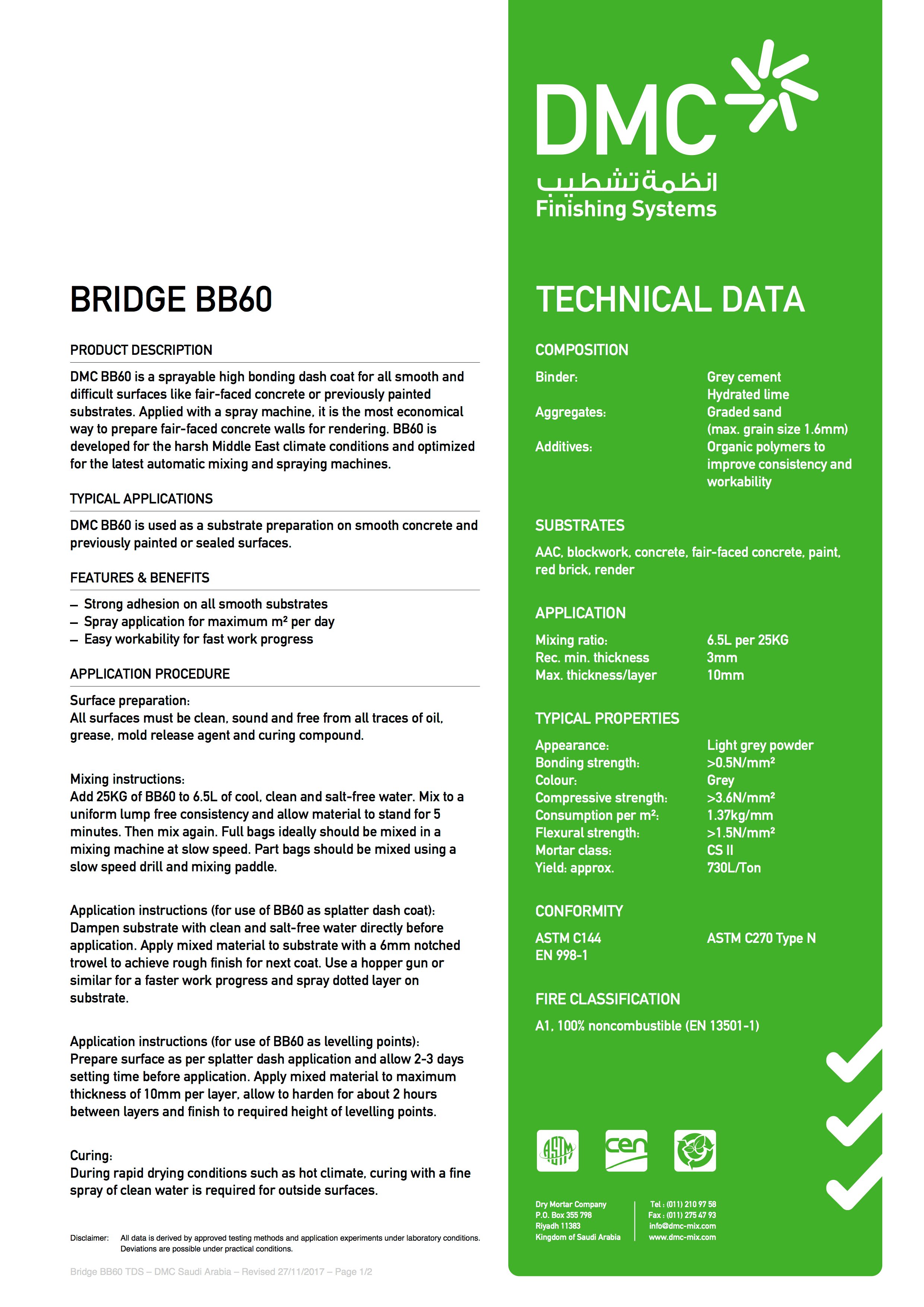 DMC Bridge BB60 is a sprayable high bonding dash coat for all smooth and difficult surfaces like fair-faced concrete or previously painted substrates