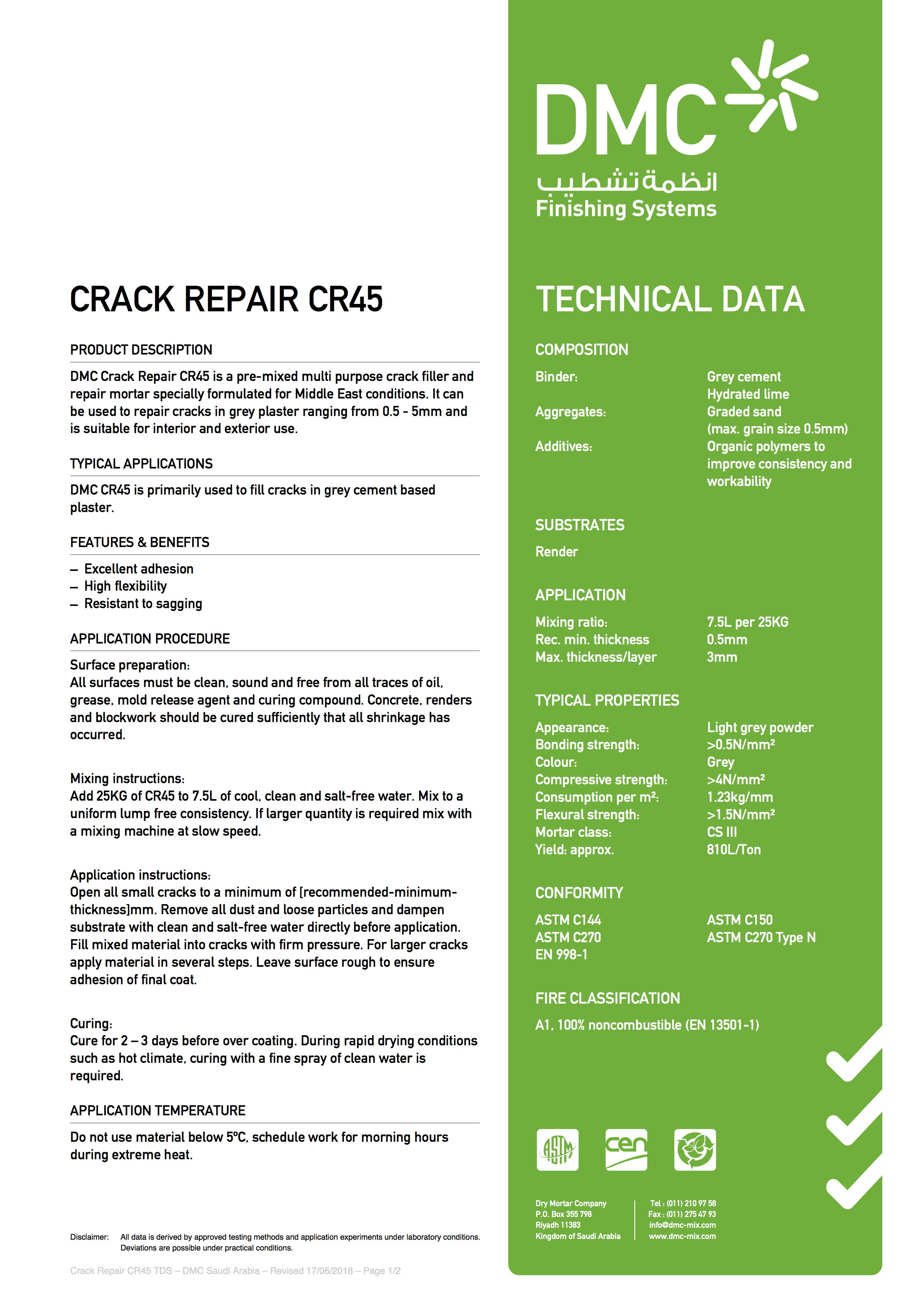 DMC Crack Repair CR45 is a pre-mixed multi purpose crack filler and repair mortar specially formulated for Middle East conditions