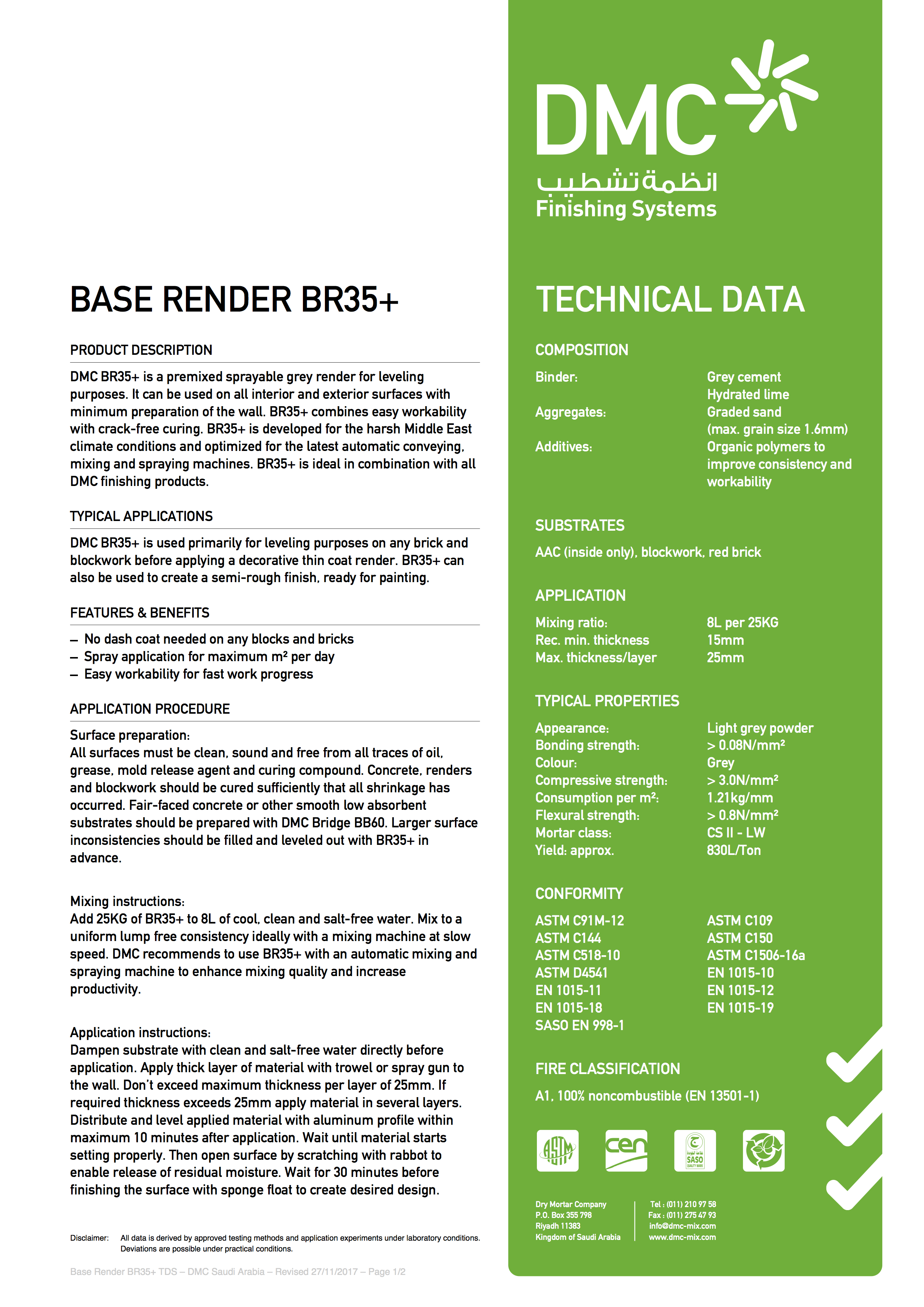 DMC Base Render BR35+ is a premixed sprayable grey render for levelling purposes that can be used on all interior and exterior surfaces with minimum preparation of the wall