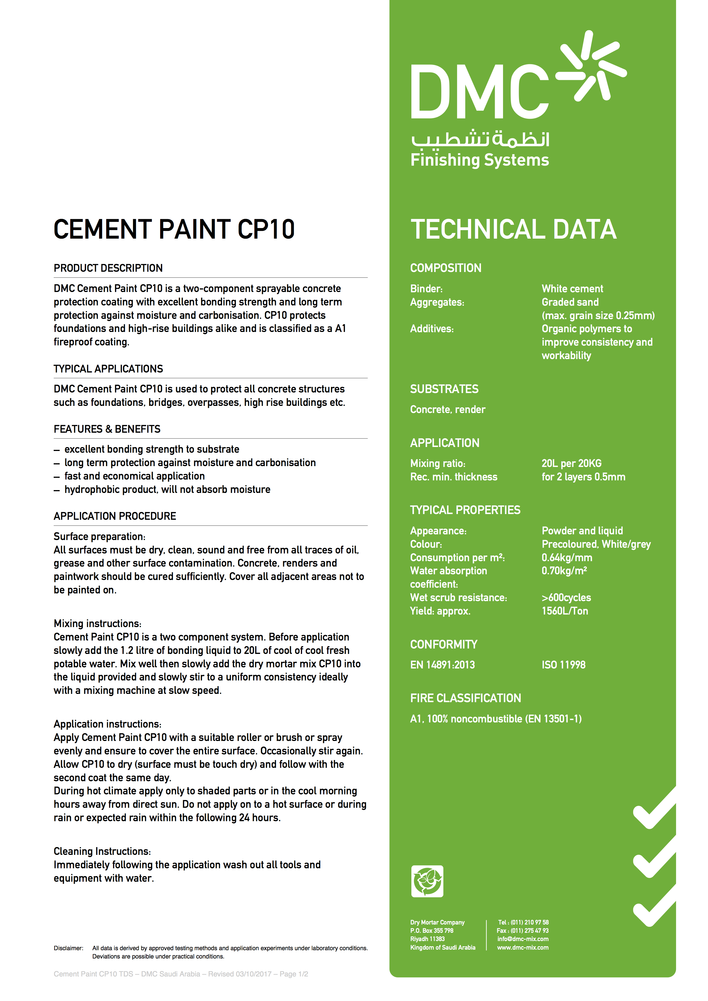 DMC Cement Paint CP10 is a two-component sprayable concrete protection coating with excellent bonding strength and long term protection against moisture and carbonisation.